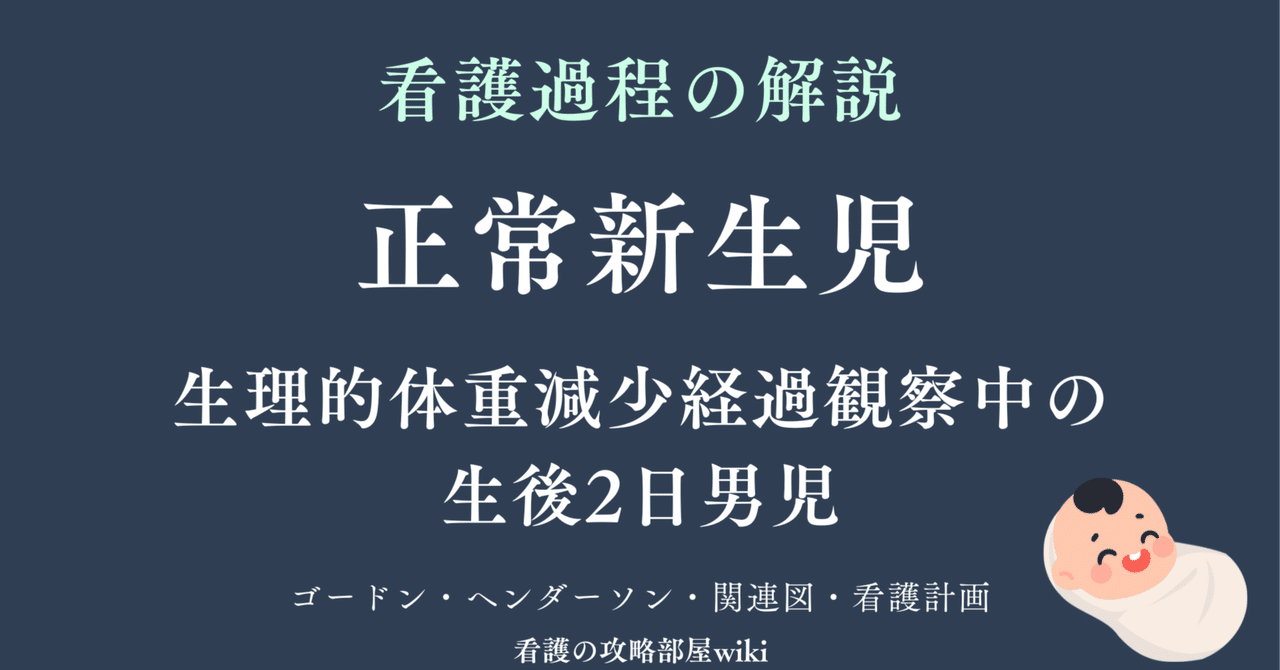 本事例のA氏は在胎週数39週2日の正期産児として出生し、Apgarスコアは1分値9点、5分値10点と良好な出生時適応を示しています。現在は生理的体重減少の経過観察中であり、減少率4.5%は正常範囲内です。これは正常な新生児の生理的変化であることを踏まえ、病的な状態との区別を明確にしてアセスメントを記載するとよいでしょう。