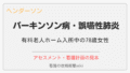 パーキンソン症状の進行により活動量が低下し、転倒リスクが高い状態にある。前傾姿勢、小刻み歩行、すくみ足といった症状により歩行の安定性が損なわれており、杖と見守りがあっても転倒の危険性は高い。実際に入居後2回の転倒歴があり、いずれも夜間のトイレ移動時であったことから、夜間の転倒リスクが特に高いと考えられる。転倒経験により本人の恐怖心が強くなり、活動への意欲が低下していることも、筋力低下や廃用症候群のリスクを高める要因となっている。レボドパ・カルビドパ配合剤を内服しているものの、症状の完全なコントロールには至っていない。
