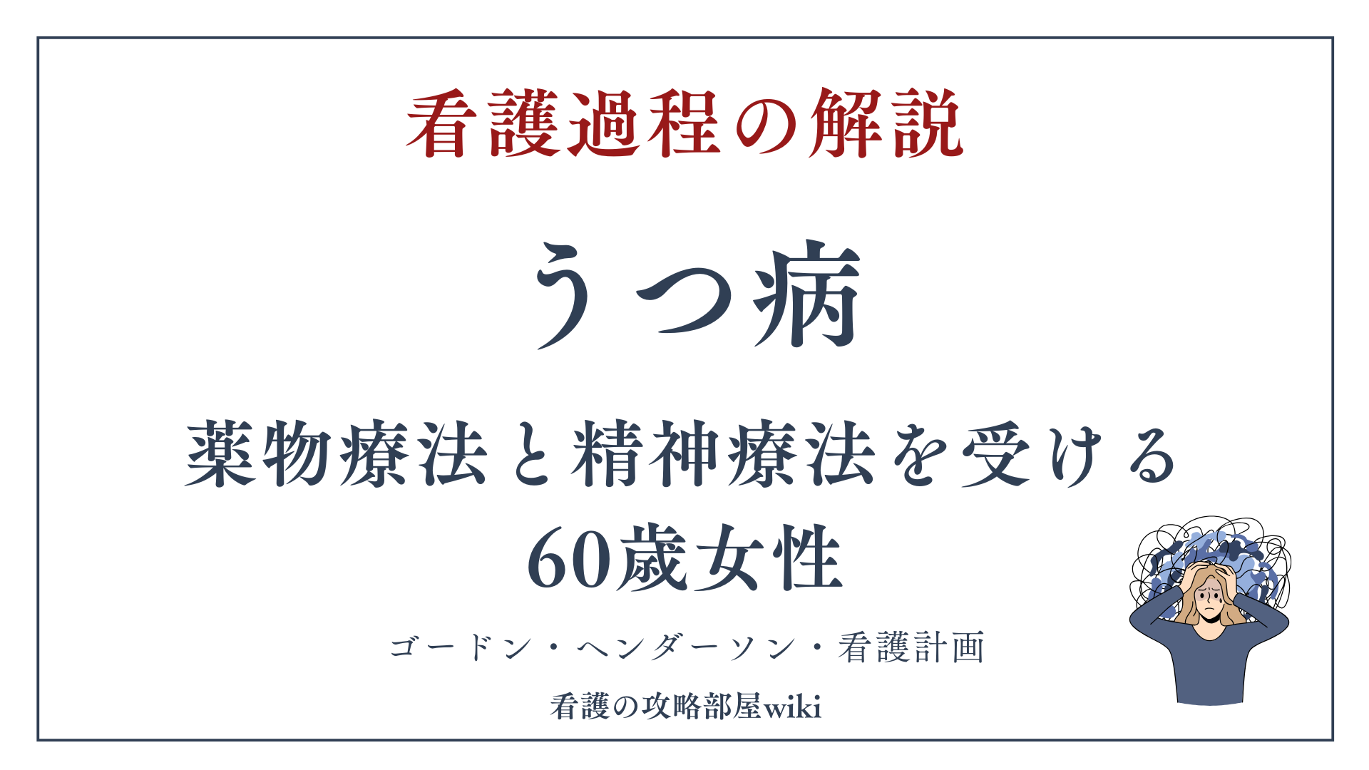 うつ病を患う60歳女性で、自宅での療養から精神科病棟への入院に至り、薬物療法と精神療法を受けながら回復を目指している事例である。介入日は10月12日で入院18日目となる。